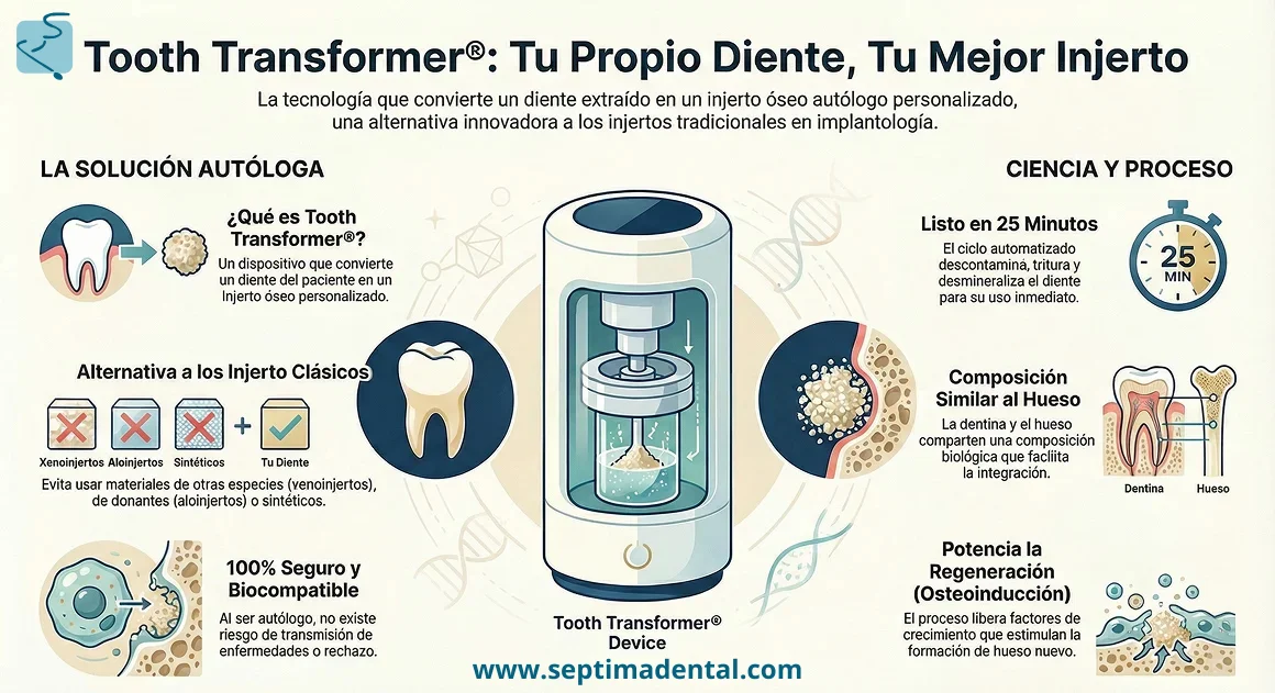 En Séptima Dental trabajamos con implantología avanzada de carga inmediata (incluida la estratégica/corticobasal) para evitar injertos en muchos casos de poco hueso. Cuando el plan requiere regeneración puntual, podemos emplear Tooth Transformer® para generar injerto autólogo a partir de un diente del propio paciente y, si procede, combinarlo con PRF para optimizar la respuesta tisular. Este enfoque minimiza cirugías adicionales, acorta tiempos y mantiene altos estándares de previsibilidad en implantes inmediatos y diferidos, según la indicación del caso. (Estrategia propia alineada con la evidencia disponible y nuestras técnicas de carga inmediata.)