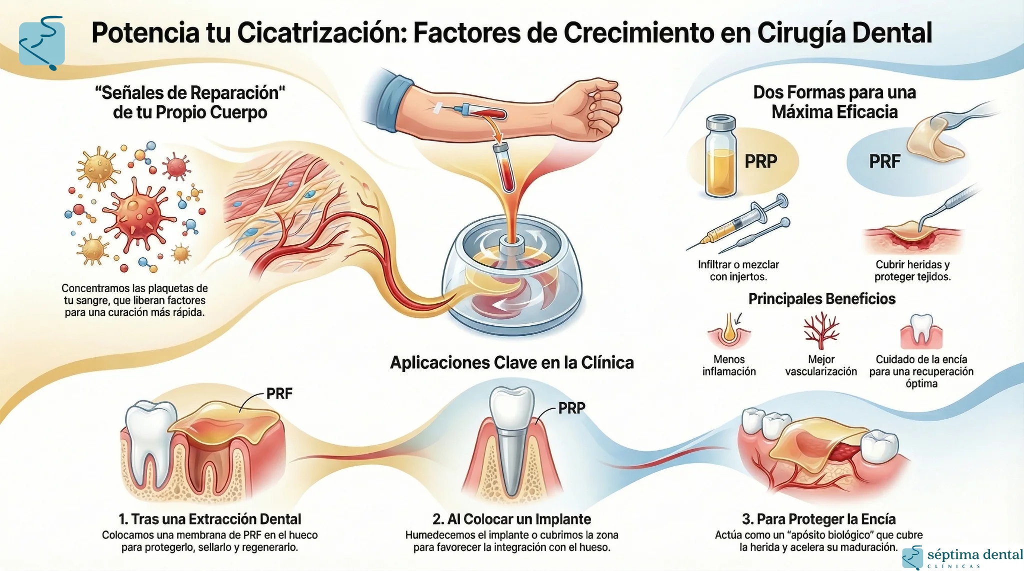 Los “factores de crecimiento plaquetario” (PRP/PRF) se obtienen de tu propia sangre y ayudan a que los tejidos cicatricen mejor. En implantología dental se usan como apoyo para cuidar la encía, favorecer la integración del implante y hacer el postoperatorio más cómodo. En Séptima Dental trabajamos con implantología de carga inmediata, incluida la estratégica corticobasal, que ancla en hueso cortical denso y evita injertos. El PRF solo supone la extracción de una muestra de sangre, es compatible con poner dientes fijos el mismo día y ayuda a que la encía cure mejor, con menos inflamación y molestias.